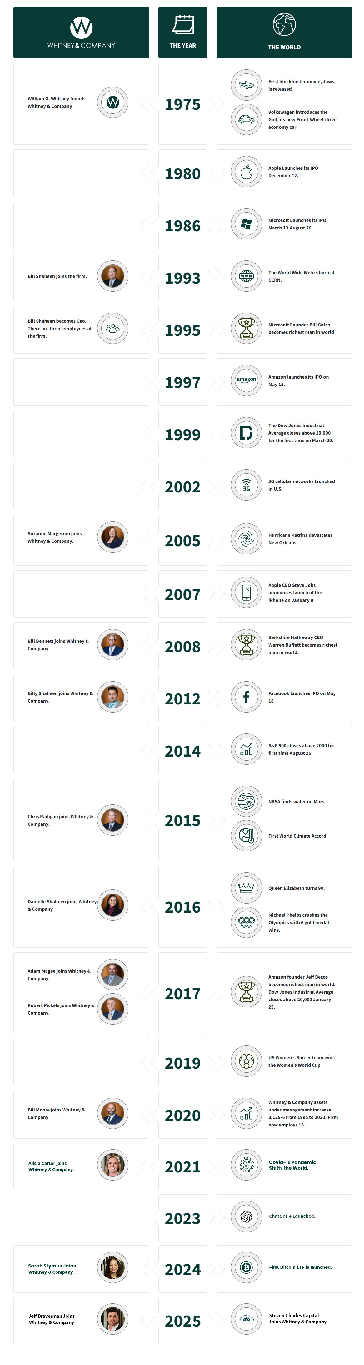 In 2025, Steven Charles Capital joined Whitney & Company, combining two family-founded, independently owned firms with shared values and a deep commitment to serving clients. Jeff now continues his work as Senior Vice President of Whitney & Company, carrying forward SCC’s mission and expanding its reach with enhanced resources and expertise.